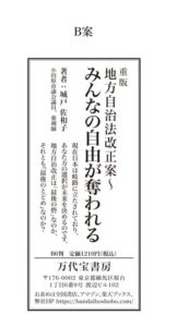 城戸 佐和子 著 B6版 130頁 2024年3月1日に閣議決定をした「地方自治法改正案」からも、日本が危機に直面し、日本人から自由が奪われていくその危険性を強く感じます。これまで何があっても希望はあると常にお伝えしてきた私の論拠として、独自性を体現できる、最後の砦となる地方自治体の存在がありました。しかし今、それすらも奪わ…