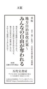 城戸 佐和子 著 B6版 130頁 2024年3月1日に閣議決定をした「地方自治法改正案」からも、日本が危機に直面し、日本人から自由が奪われていくその危険性を強く感じます。これまで何があっても希望はあると常にお伝えしてきた私の論拠として、独自性を体現できる、最後の砦となる地方自治体の存在がありました。しかし今、それすらも奪わ…