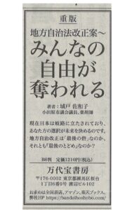 城戸 佐和子 著 B6版 130頁 2024年3月1日に閣議決定をした「地方自治法改正案」からも、日本が危機に直面し、日本人から自由が奪われていくその危険性を強く感じます。これまで何があっても希望はあると常にお伝えしてきた私の論拠として、独自性を体現できる、最後の砦となる地方自治体の存在がありました。しかし今、それすらも奪わ…
