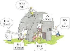 数人の盲人が象の一部だけを触って感想を語り合う、というインド発祥の寓話がある。